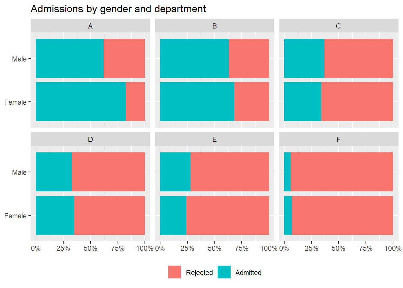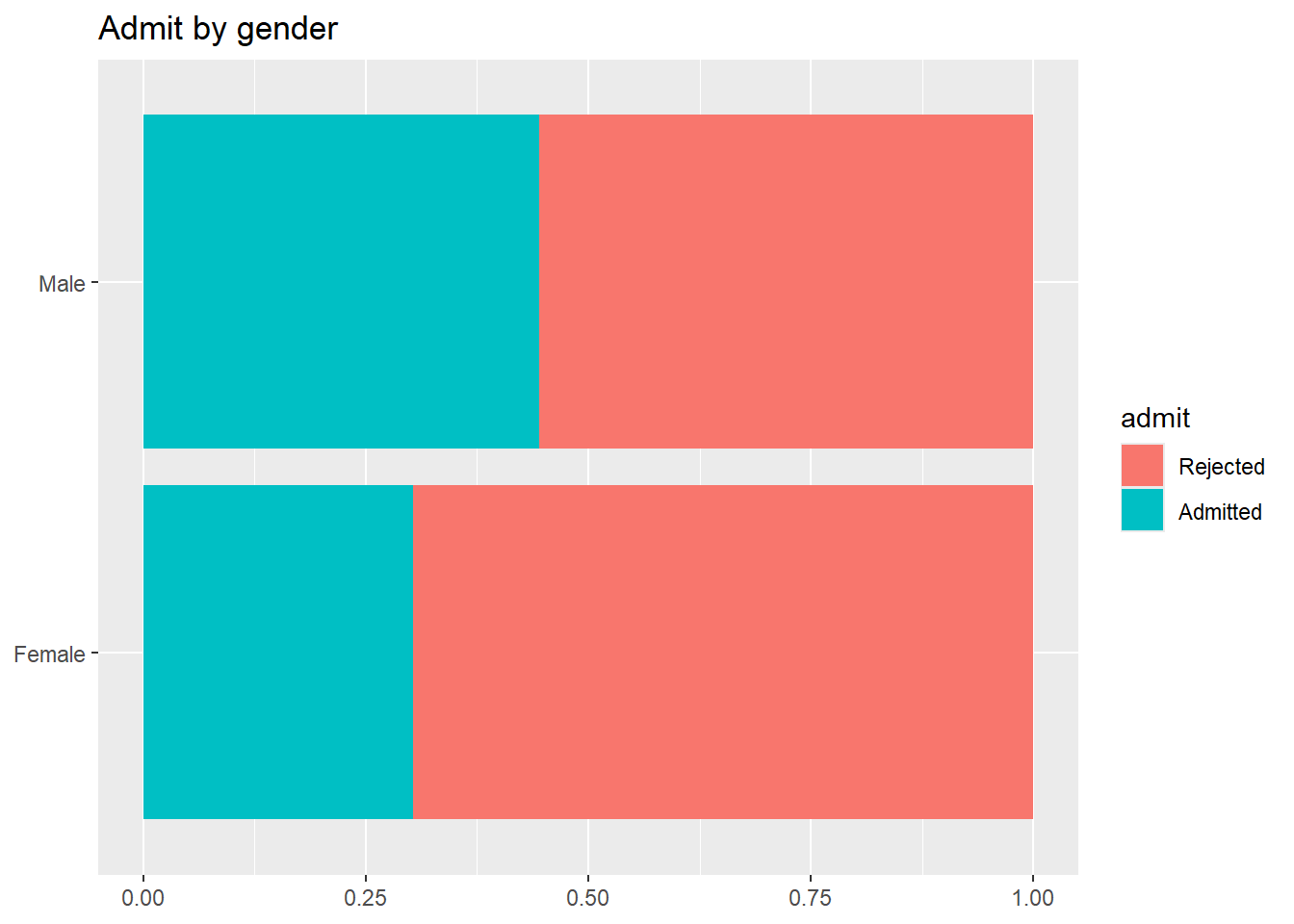 ggplot(ucbadmit, aes(y = gender, fill = admit)) +geom_bar(position ="fill") +labs(title ="Admit by gender",y =NULL, x =NULL)