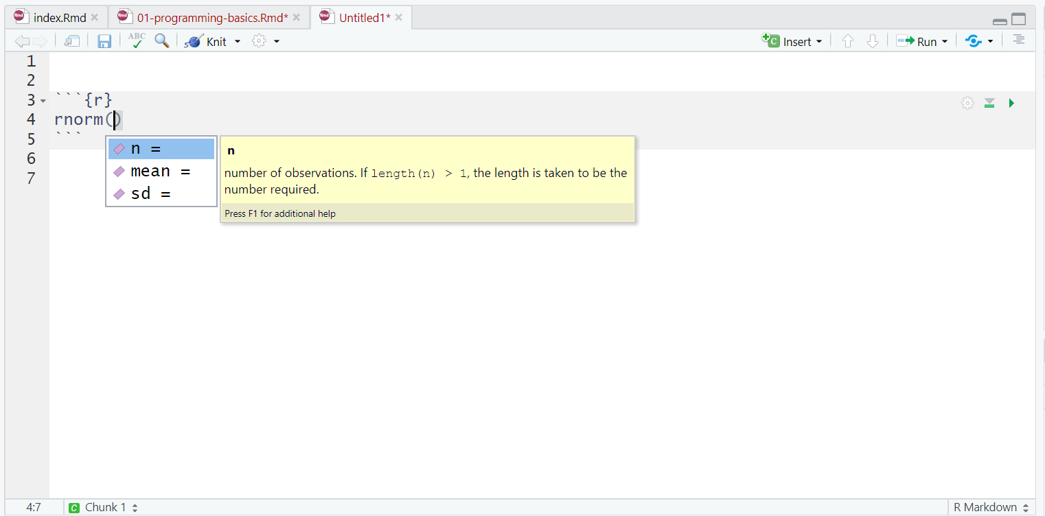 - R Studio’nun çok kullanışlı bir özelliği, fonksiyonlar için TAB otomatik tamamlama özelliğidir (bkz. Şekil @ref(fig:img-autocomplete)). Fonksiyonun adını yazıp tab tuşuna basarsanız, R Studio size fonksiyonun aldığı argümanları kısa bir açıklama ile birlikte gösterecektir. Argüman adının üzerinde enter tuşuna basarsanız, tıpkı telefonunuzdaki otomatik tamamlama gibi adı sizin için dolduracaktır. Bu, R’yi ilk öğrenirken inanılmaz derecede kullanışlıdır ve bu özelliği sık sık kullanmayı unutmamalısınız.